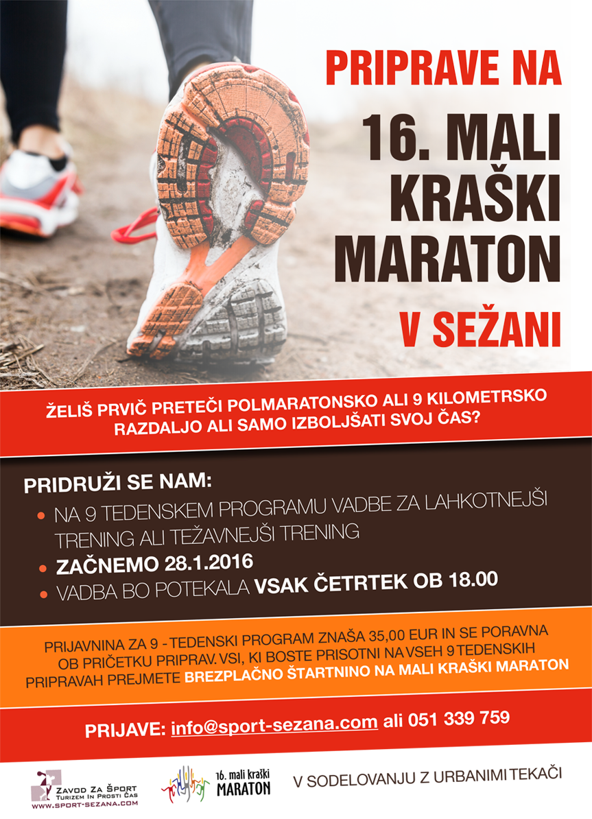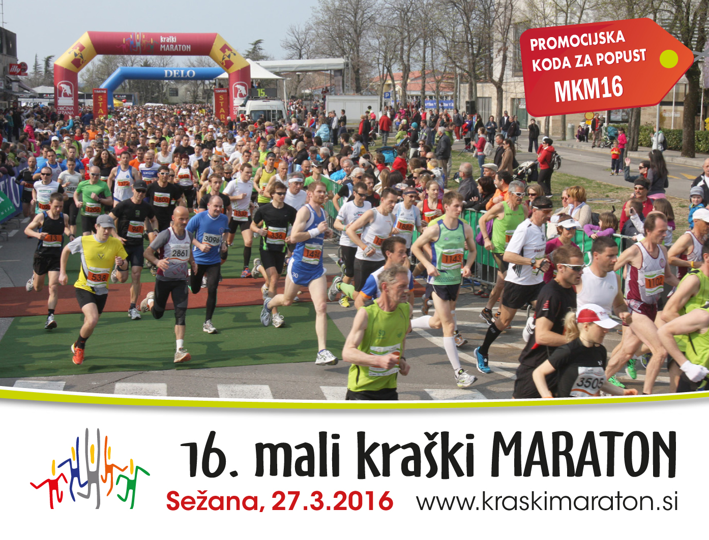 Štart vseh tekov bo na parkirišču pri nogometnem stadionu v Sežani. Štart in cilj bo označen z velikim napihljivim lokom Malega kraškega maratona. Zaradi velikega števila tekačev vas pozivamo, da se na štart odpravite pravočasno, vsaj 15 minut pred začetkom polmaratona, ki bo ob 10.16 uri.