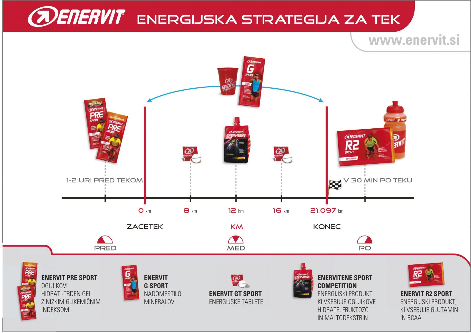 Med tekom je koristno, da z vnosom zunanje energije nadomestimo izčrpavanje lastnih virov, ki se porabljajo v fazah dolgotrajnega napora. Za dopolnitev izgub, ki jih povzroča potenje, je priporočljivo, da se pije redno, in sicer v majhnih požirkih. Nujno je tudi narediti plan, kdaj oz. na katerem kilometru bomo pojedli Enervitene gel ali Enervitene cheerpack.