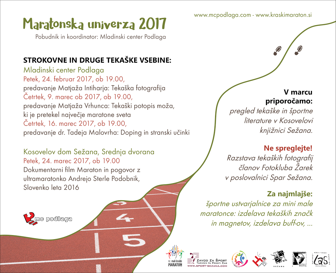 Na tekaškem potopisu bo z nami Matjaž Vrhunc, mož, ki je pretekel vse največje maratone sveta; o dopingu, prehranskih dopolnilih in njihovih stranskih učinkih bo spregovoril mednarodno priznan strokovnjak dr. Tadej Malovrh; po dokumentarnem filmu Maraton! v Kosovelovem domu, ki govori o tem, da pravica do teka ni bila za vse vedno samoumevna, pa bo z nami ultramaratonka in Slovenka leta 2016, Andreja Sterle Podobnik. Maratonsko univerzo bomo pričeli s fotografskim predavanjem Matjaža Intiharja o tekaški fotografiji v petek, 24. februarja 2017, ob 19. uri v MC Podlaga.