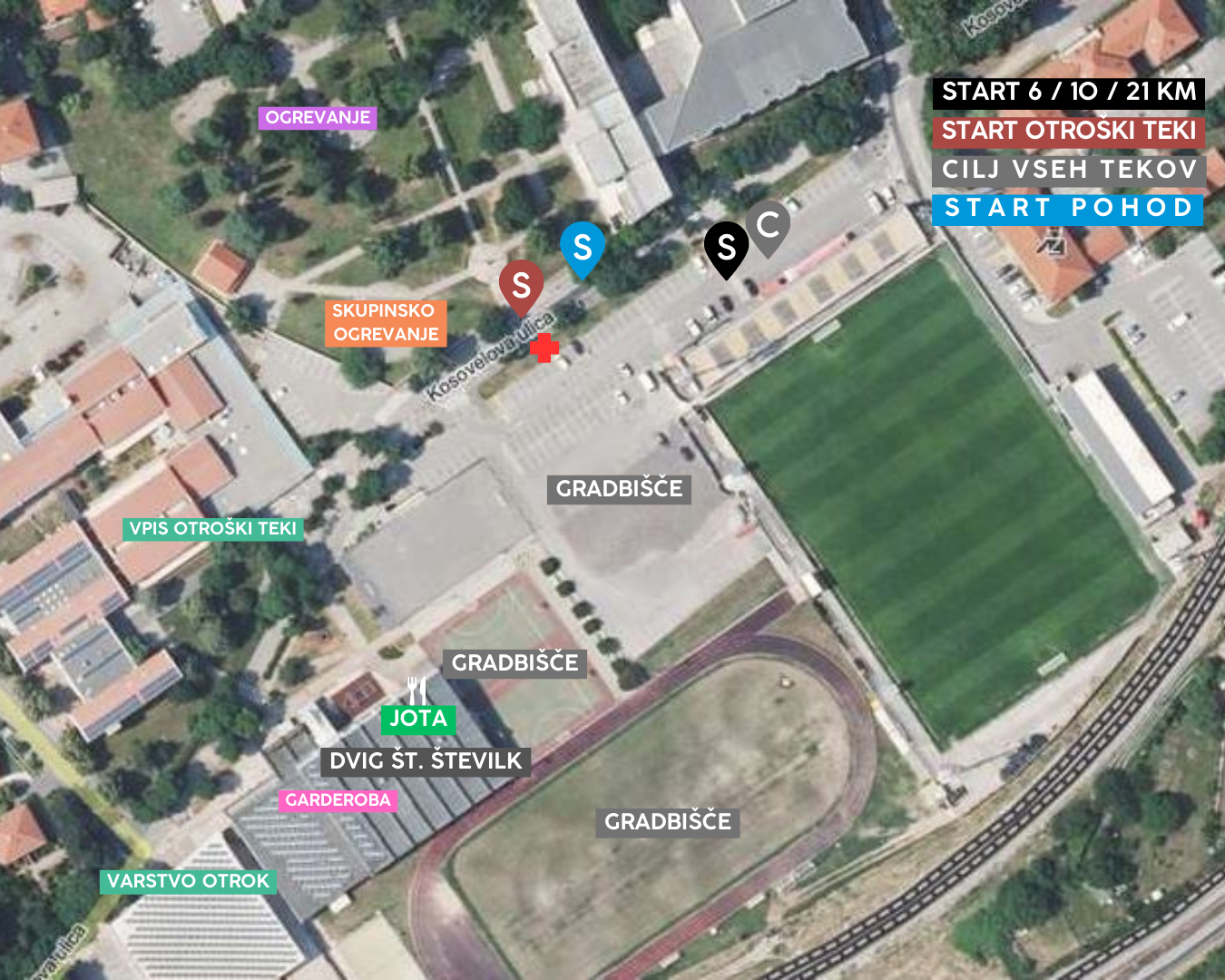 Start tekov na 6 km, 10 km in 21 km bo na parkirišču pred nogometnim stadionom v Sežani. Štart in cilj bo označen z veliko štartno - ciljno konstrukcijo. Priporočamo vam, da se na štart, ki bo ob 11.00 uri, odpravite pravočasno, vsaj 15 minut prej.